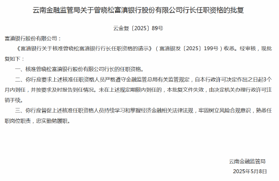 5月14日金融一线音书,云南金融监管局发布批复默示,核准曾晓松富滇银行股份有限公司行长的任职履历。